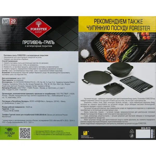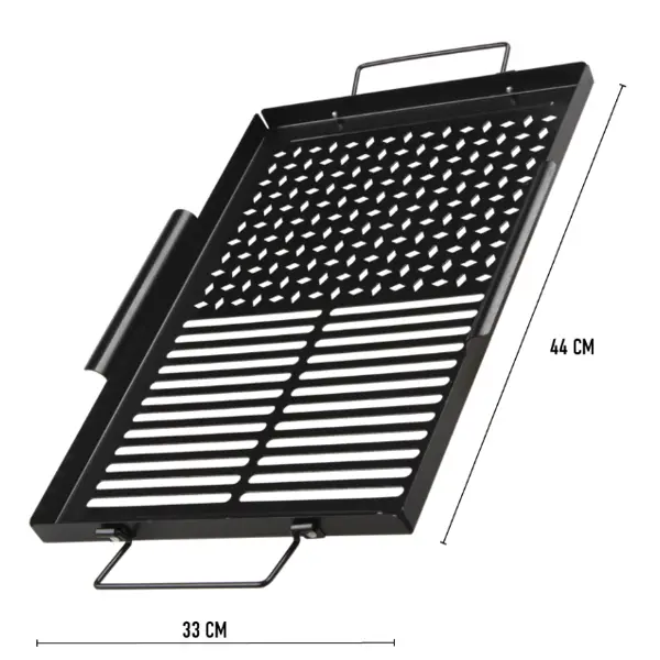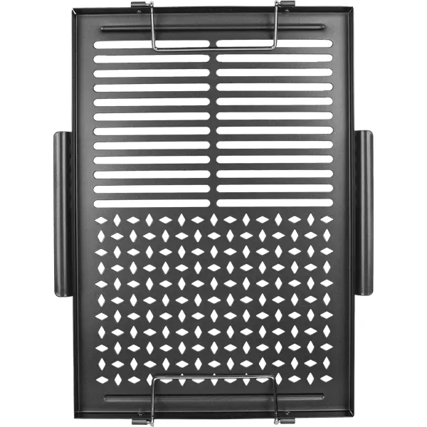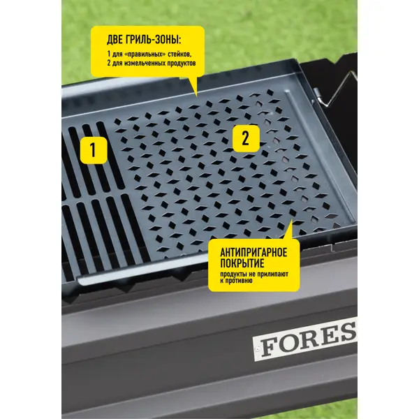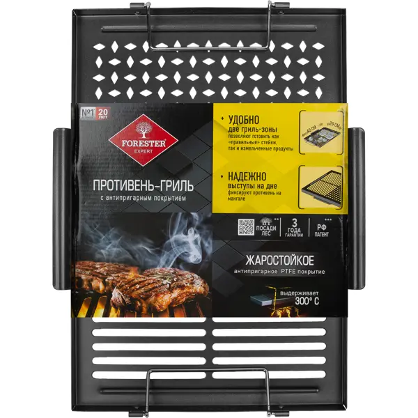 **Противент-гриль Forester** имеет две рабочие гриль-зоны, которые позволяют готовить как крупные стейки, так и мелко нарезанные продукты. Причем делать это можно одновременно: размеры поверхности позволяют разместить ингредиенты для различных блюд или нескольких порций на большую компанию. Полоски и решеточка на противне оставляют на продуктах характерный рисунок. Ребра на дне изделия фиксируют противень-гриль Forester на мангале. Складные ручки выходят за пределы горячей зоны, поэтому не так сильно нагреваются, как рабочая поверхность. Антипригарное покрытие поверхности не позволяет продуктам прилипать к противню в процессе готовки. После использования противень-гриль для барбекю легко и быстро моется. Не рекомендуется использовать для очистки абразивные средства. **Особенности:** - продукты не прилипают к противню благодаря антипригарному покрытию; - две гриль-зоны позволяют готовить как «правильные» стейки, так и измельченные продукты; - дополнительную устойчивость противня на гри