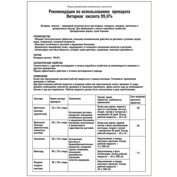 **Янтарная кислота** — универсальное средство для повышения урожайности и стимуляции роста растений. Используется в виде раствора для полива, опрыскивания садово-огородных культур, замачивания семян и черенков. ### Преимущества средства - Безопасно для растений. - Повышает содержание витаминов в плодах. - Стимулирует развитие естественной микрофлоры в грунте.