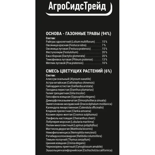 | Состав | Газонные травы 94%, Смесь цветущих растений 6% |