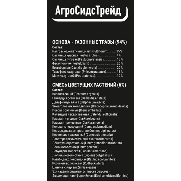 | Состав | Газонные травы 94%, Смесь цветущих растений 6% |