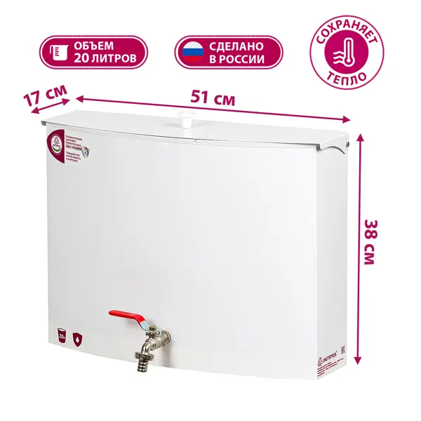 **Умывальник Мастерица W-20М**Умывальник без ЭВН Мастерица W-20М, бак 20L настенный белый. Антикоррозийное гальваническое цинковое покрытие бака. Предназначен для садового участка, дачи, гаража, мастерской и других мест, где нет центрального водопровода. Модель оснащена встроенным краном для воды. Возможность подогрева не предусмотрена. **Параметры изделия:** 51х38х17см (ДхШхГ). Вес 4,2кг. **Преимущества:** бак оцинкованный с антикоррозийным покрытием (НОВАЯ ТЕХНОЛОГИЯ: Гальваническое цинковое покрытие), пробка в баке для слива воды, металлический шаровый кран (приспособлен для крепления шланга), компактные размеры, стильный дизайн. Сделано в России. Гарантийный срок - 12 месяцев.