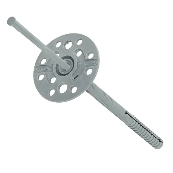 **Тарельчатый дюбель IZO 10Х160** состоит из следующих элементов: дюбель с двухсегментной распорной зоной и увеличенной прижимной шайбой диаметром 60 мм, и распорный элемент – гвоздь. Материал, из которого изготовлены дюбель и гвоздь – полипропилен. Дюбель предназначен для крепления теплоизоляционных строительных материалов и изделий (толщиной до 150 мм) к основаниям из бетона, кладки из полнотелого, силикатного и пустотелого керамического кирпича, ячеистого бетона. Установка производится методом сквозного монтажа. В среднем на 1 кв. м площади теплоизоляции применяется 5-8 дюбелей. **БЕРЕЖНО К ЛЮДЯМ, БЕРЕЖНО К ПРИРОДЕ** - Товар содержит не менее 15% вторичного сырья в составе. Выбирая продукцию с переработанными материалами, вы помогаете сокращать количество отходов на полигонах и поддерживаете ответственное потребление.