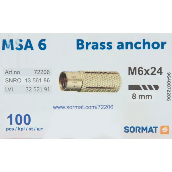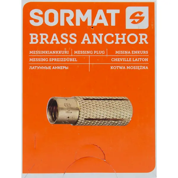 **Анкер Sormat MSA 6** предназначен для монтажа тяжелых и умеренно тяжелых элементов и конструкций. Устанавливается в бетоне, природном камне. Позволяет монтировать изделия в поверхностях недостаточно высокого качества, например, при невозможности определить материал основания. ### Особенности: - изготовлен из латуни; - в упаковке находятся 100 шт.