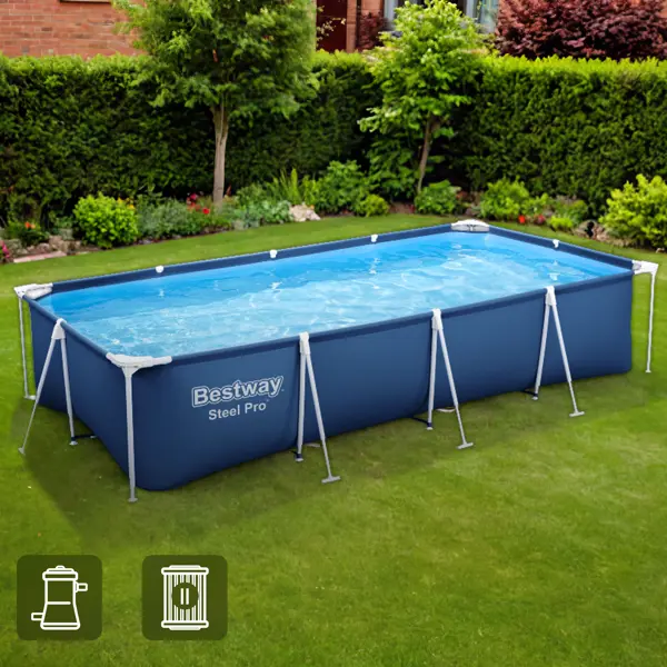 **Бассейн каркасный прямоугольный Bestway 56424 BW** — усиленный летний бассейн размером 4 метра x 2.11 метра с насосом в комплекте. Глубина 81 см. Этого хватает для наполнения ~5700 литрами воды. Подойдет для семейной пары с детьми. Прочная чаша из 3-слойного ПВХ (2 слоя винила, 1 слой полиэстера), нержавеющий каркас из оцинкованной стали. Для монтажа достаточно ровной площадки, собирается с участием 2-3 человек за 20 минут. Легко разобрать в конце сезона. Благодаря адаптеру под сливной шланг воду можно сливать в любое удобное место. Предназначен для подключения шлангов Ø 32 мм. Гарантия 180 дней. **Важно:** использование бассейна детьми рекомендуется только под присмотром взрослых. ### Преимущества: - Подкладка из материала повышенной прочности DuraPlus. - Простая сборка без инструментов. - Трубы с антикоррозийным покрытием и пластиковые Т-образные соединители стержней для предотвращения ржавчины. - Встроенный сливной клапан с адаптером для шланга. ### В комплекте: