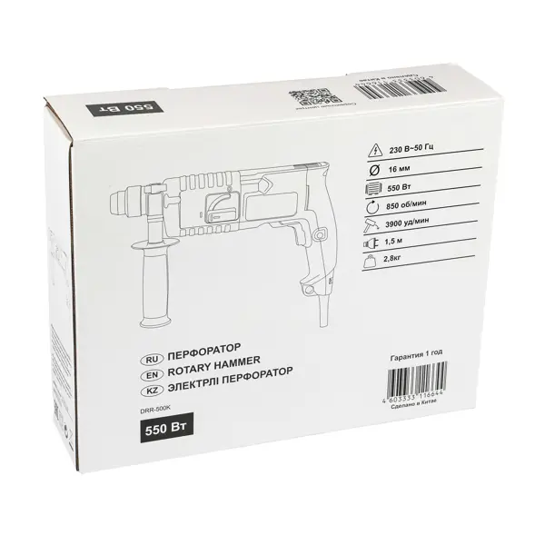 **Сетевой перфоратор DRR-500K** предназначен для бурения отверстий разного диаметра в бетоне, стали или дереве. Данная модель подходит для бытового использования. Перфоратор комплектуется боковой рукояткой для надёжного удержания инструмента, а также ограничителем глубины сверления. ### Особенности: - Два режима работы - сверление и сверление с ударом; - Максимальный диаметр сверления в бетоне - 16 мм; - Патрон стандарта SDS+.