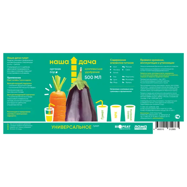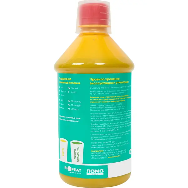 | Состав | Натриевые и калиевые соли гуминовых и фульвокислот. Содержание макроэлементов: N - 10,5, P - 3,5, K - 21, Mg - 1,2, S - 0,9 г/л Содержание микроэлементов: Fe - 28, Zn - 28, Cu - 20, Mn - 84, Mo - 8, B – 41 мг/л |