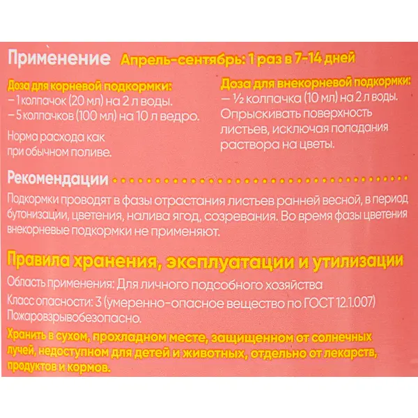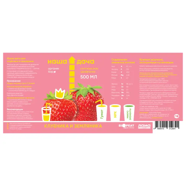 | Состав | Содержание макроэлементов: N -9,1, P - 17,5, K - 25,2, Mg - 2,52, S - 2,1 г/л Содержание микроэлементов: Fe - 9,8, Zn - 9,8, Cu - 1,7, Mn - 29,4, Mo - 0,56, B – 14 мг/л |