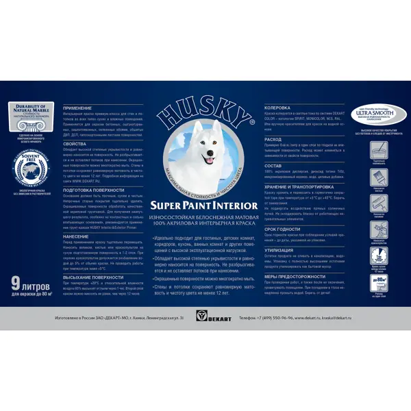 **Суперстойкая интерьерная краска Husky Super Paint Interior** — матовая 100 % акриловая краска премиум-класса для стен и потолков во всех типах сухих и влажных помещений, включая ванные комнаты. Краска обеспечивает исключительную легкость нанесения в сочетании с практически идеальным качеством и долговечностью покрытия. Окрашенные поверхности сохраняют равномерную матовость и чистоту цвета не менее 12 лет. Страна производства — Россия. ### Преимущества краски - Практически не имеет запаха. - Сертифицирована для детских и медицинских учреждений - Не образует потеков, легко наносится. - Обладает высокой степенью укрывистости. - Компьютерная колеровка в темные и насыщенные оттенки. - Окрашенные поверхности можно многократно мыть с бытовыми моющими средствами (1 класс влажного истирания). - Стены и потолки сохраняют равномерную матовость и чистоту цвета не менее 12 лет. ### Расход 8 м²/литр в один слой по гладкой невпитывающей поверхности. Расход может изменяться в зависимости от свойс
