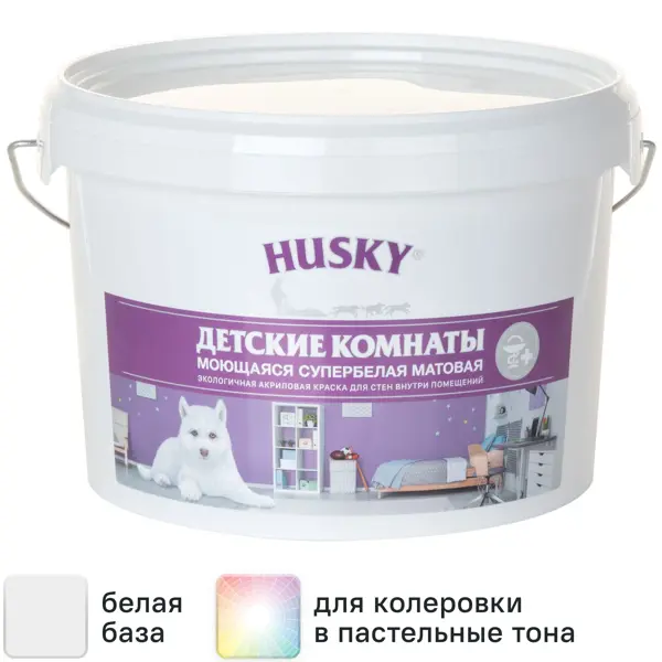 **Краска для детских комнат Husky** — супербелая матовая 100% акриловая краска премиум-класса для высоко­качественной окраски потолков и стен в жилых помещениях. Окрашенные поверхности можно мыть с применением неабразивных бытовых моющих средств. Страна производства — Россия. ### Преимущества краски