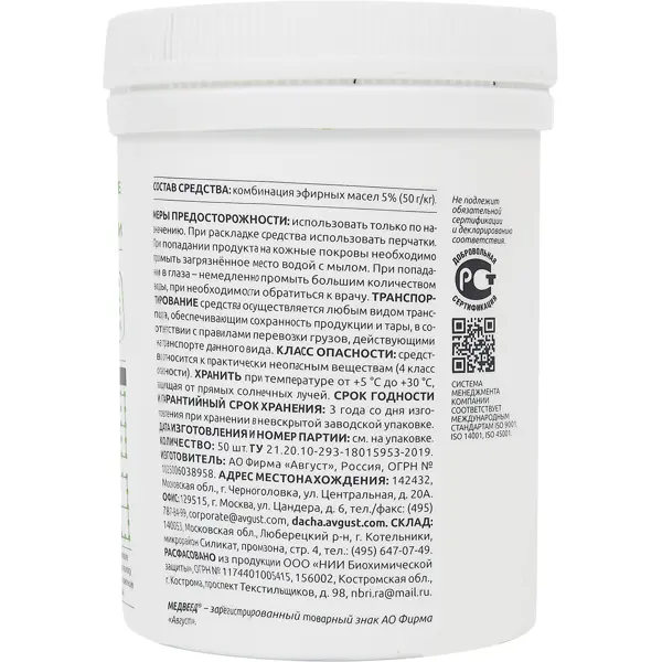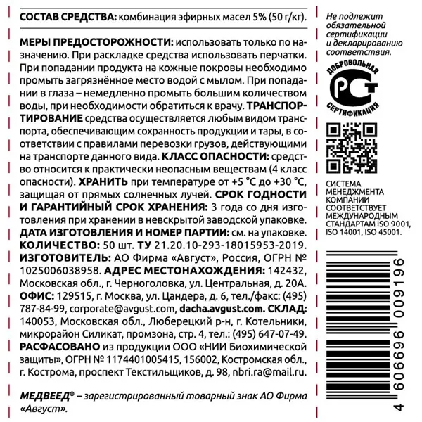 | Применение продукта | Отпугивающее средство в виде шариков с эфирными маслами для защиты приусадебных участков от медведки. Инновационная форма! Безопасно для человека и окружающей среды! |