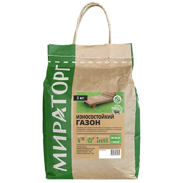 **Семена газона Мираторг износостойкий** предназначен быстрого озеленения игровых площадок. Первые всходы появляются уже на 12 сутки после посадки. Характеризуется устойчивостью к внешним воздействиям. Сохраняет насыщенность цвета в течение всего сезона. Одного пакета достаточно, чтобы засеять до 60 м² нового газона или обработки 100 м² в виде реставрации. Подробная инструкция по высеву и уходу размещена на обороте. ### Особенности: - вес товарной упаковки составляет 2 кг; - в состав входят семена райграса пастбищного, райграса многолетнего, овсяницы красной, мятлика лугового.