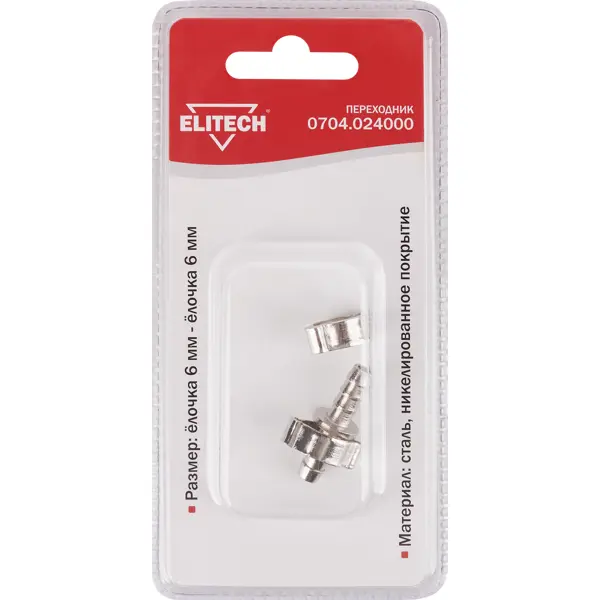 **Переходник Elitech** предназначен для оснащения компрессора. Используется для обустройства прочного и надежного соединения посредством штуцера елочка 6 мм. ### Особенности: - корпус изготовлен из стали; - покрытие никелированное; - в товарной упаковке находится переходник и 2 кольца 10-15 мм.