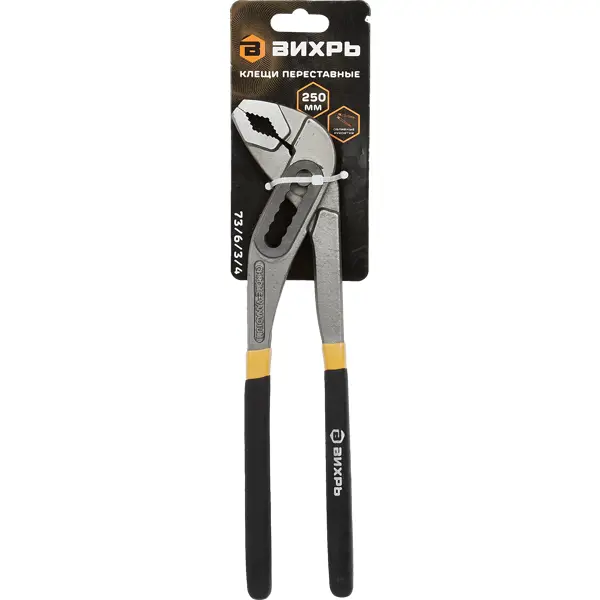 **Клещи переставные Вихрь** — изогнутый инструмент с прямым резом, который служит для надежного захвата, удержания и поворота деталей круглой формы. Широко применяется в ремонтных, строительных и сантехнических работах. Прекрасно подходит для скручивания или гибки деталей. Рукоятка обеспечивает надежный захват, максимально контролируя давление клещей для более точного выполнения поставленной задачи. ### Особенности: - размер — 250 мм; - небольшой вес — 429 г; - глубина зажима достигает 30 мм; - прорезиненные, нескользящие ручки; - наличие переставного механизма; - устойчивость к высокому давлению и механическому воздействию; - длительный эксплуатационный срок.