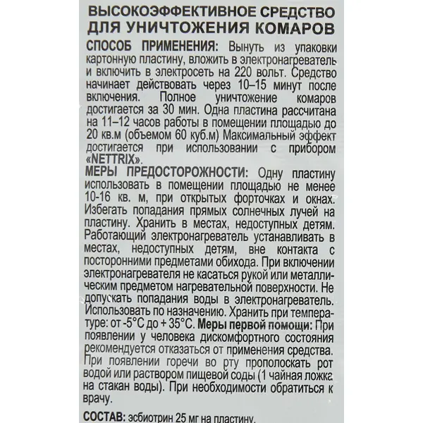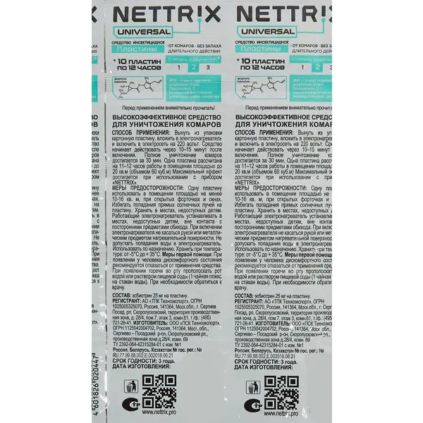 **Пластины от комаров Nettrix 12 часов** NETTRIX Universal Пластины от комаров длительного действия предназначены для защиты от комаров в помещении. Пластина изготовлена из чистой натуральной целлюлозы и хлопковых волокон, пропитана раствором препарата. В его состав входят 2 активных компонента - эсбиотрин и масло Нима, быстро уничтожающие комаров. Пластина имеет 3 отверстия, пропускающие воздух от нагревателя. Этим достигается быстрое начальное действие пластины. **Применение:** 1. Вынуть из упаковки картонную пластину, вложить в электрофумигатор, включить в электросеть (220 V, 50 Гц). 2. Средство начинает действовать через 10-15 минут после включения. Полное уничтожение комаров достигается за 30 мин. 3. Одна пластина рассчитана на 11-12 часов работы в помещении площадью до 20 кв.м (объемом 60 куб.м). 4. Максимальный эффект достигается при использовании с прибором «NETTRIX». Меры предосторожности: 1. Одну пластину использовать в помещении площадью не менее 10 кв. м, при открытых фо