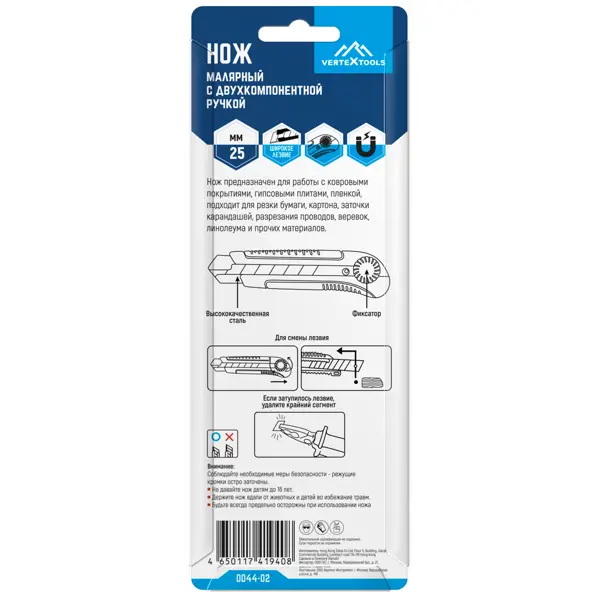 **Нож строительный Vertextools 0044-02** имеет пластиковый корпус и сегментное лезвие. Предназначен для решения разных задач — им можно резать бумагу, текстиль, пластик и другие материалы. Обрезиненная рукоятка надежно лежит в ладони и не выскальзывает в процессе работы — это обеспечивает комфортную эксплуатацию и максимальный контроль над инструментом. Лезвие изготовлено из стали, что делает его прочным и износостойким, корпус — из пластика. ### Особенности: - ширина лезвия — 25 мм; - длина — 177 мм; - сменное выдвижное лезвие; - большой ресурс; - малый вес — 0,129 кг.
