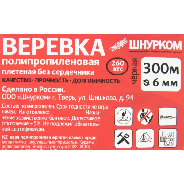 **Веревка полипропиленовая** используется для постановки тентов и палаток, при перевозке грузов, оборудовании спортивных и игровых площадок, в туризме и хозяйственных целях. Сердечник и оплетка изготовлены из прочной мультифиламентной нити. Веревка диаметром 6 мм устойчива к воздействию ультрафиолета и ударным нагрузкам, выдерживает нагрузку на разрыв до 260 кг. Продается на отрез.