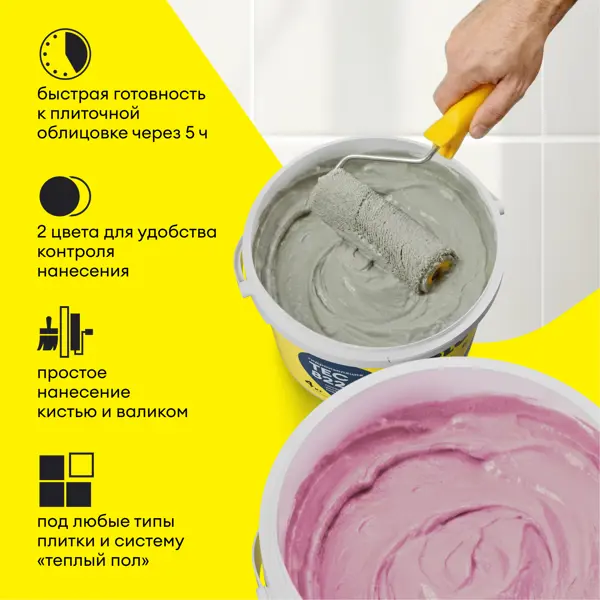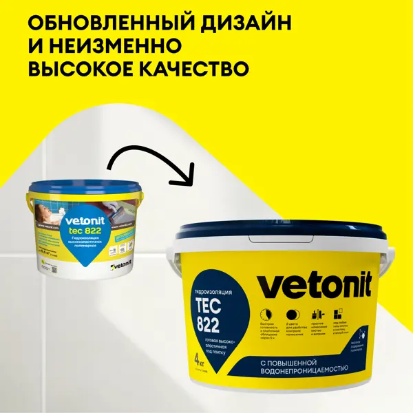 **Vetonit Tec 822 (Ветонит Тек 822)** — обмазочная гидроизоляционная мастика на основе полимеров, полностью готовая к применению. С ее помощью можно выполнить гидроизоляцию любых влажных помещений (ванная, кухня, балкон, лоджия и прочие). Смесь не подходит для гидроизоляции фундаментов, цоколей, резервуаров со стоячей водой. Высоко эластичная гидроизоляционная мастика выдерживает раскрытие трещин благодаря растяжению до разрыва более 270%, а также отличается повышенной прочностью сцепления с основанием. **Особенности применения:** Гидроизоляционная мастика Vetonit Tec 822 может использоваться на бетонных, цементных и гипсовых основаниях. Наносится в 2 слоя, для контроля нанесения которых готовую смесь можно купить в двух цветах (розовый и серый). **Советы по использованию:** Перед тем, как нанести гидроизолирующий полимерный состав, поверхность нужно тщательно подготовить: она должна быть ровной, прочной и сухой. 1. Выполняется демонтаж старого покрытия, устройство бетонно