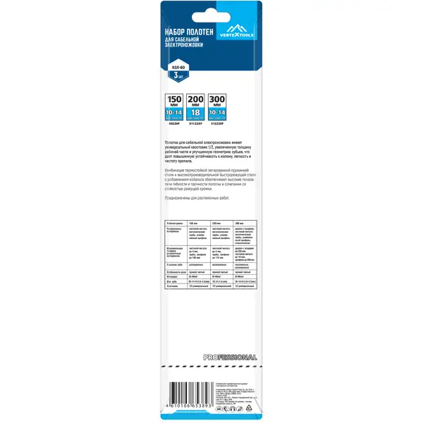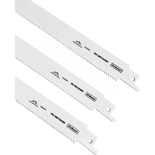 **Набор полотен для сабельной пилы Vertextools НП-150-200-300** представляет собой комплект из узких пластин, имеющих режущую часть и заточенные зубья с шагом 1,8-2,5 мм. Предназначены для распиловочных работ. Для фиксации на сабельной электроножовке предусмотрено специальное отверстие. Материалом для изготовления служит биметалл, делающий полотна прочными и износостойкими. ### Особенности: - в комплекте 3 штуки; - зубья — переменные, разведенные; - легкая и простая установка; - высокая эффективность; - устойчивость к деформациям; - подходит для работы по металлу, пластику и дереву; - рабочая длина — 300 мм; - малый вес — 120 г.
