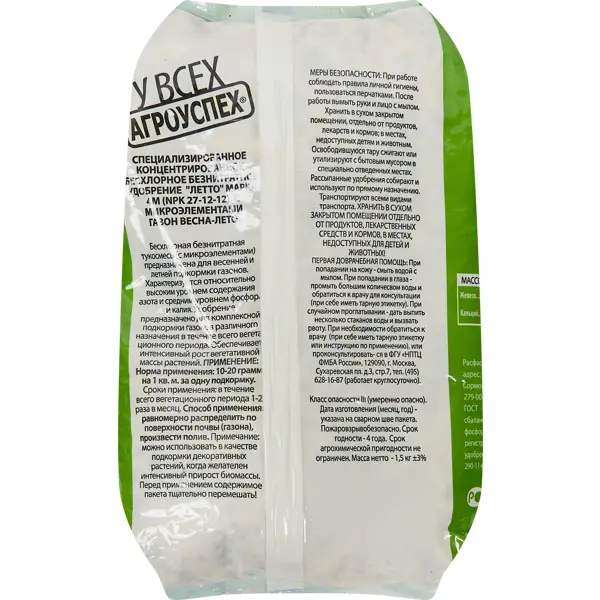 **Удобрение Газон с микроэлементами** предназначено для приготовления раствора для опрыскивания или полива растений. Повышает питательные свойства грунты. Подходит для использования в весенние и летние месяцы. Подробная инструкция размещена на упаковке. ### Особенности: - одной упаковки достаточно для обработки площади 100 м²; - не содержит хлора и нитратов; - перед использованием удобрение следует перемешать; - вес — 1,5 кг.