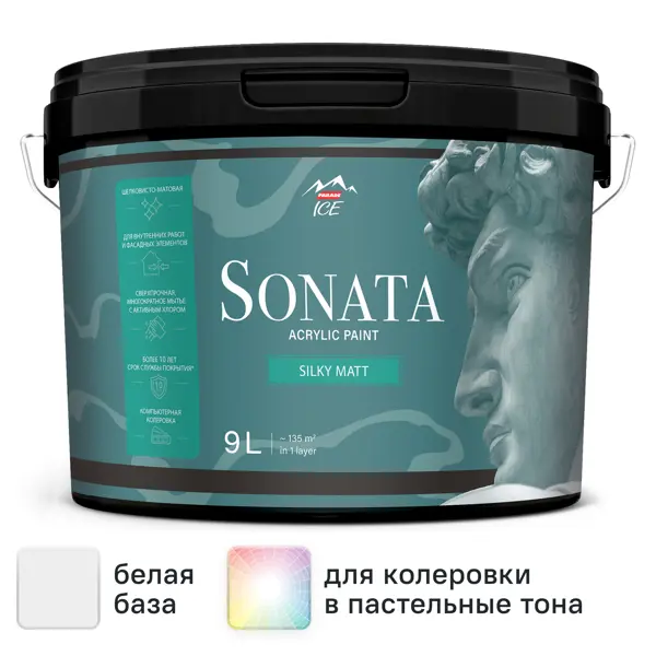 Краска для стен и потолков Parade Sonata Silky Matt моющаяся шелковисто-матовая цвет белый база А 9 л