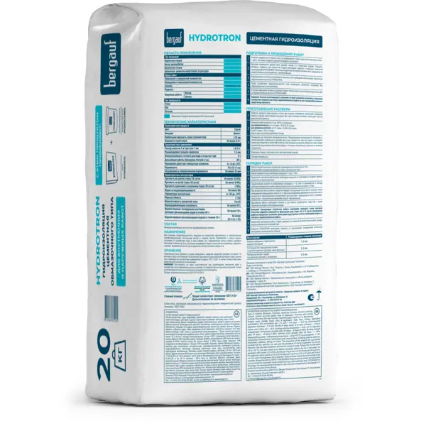 Hydrotron 20 кг, цементная гидроизоляция обмазочного типа трещиностойкая, используется для внутренних и наружных работ по следующим типам оснований: кирпич, бетон, железобетон, цементная стяжка, цементная, цементно-известковая штукатурка. Подходит для гидроизоляции фасада здания, цоколя, подвалов, бассейнов (глубиной до 5м). Легко наносится кистью или валиком. **Особенности:** - Расход смеси на 1 кв.м при слое 1 мм -1,8-2 кг, - Жизнеспособность готового раствора в открытой таре – 3 ч, - Дальнейшие работы (облицовка плиткой и т.д) – через 48 ч, - Рекомендуемая толщина нанесения – 1-5 мм, - Проведение работ при температуре основания от +5 до 35 °С **БЕРЕЖНО К ЛЮДЯМ, БЕРЕЖНО К ПРИРОДЕ** - Самодекларация экологичности товара - это заявления производителя о экологических свойствах продукции, которые не подтверждены независимой экспертизой. Производитель, использующий самодекларацию «VOC free» заявляет об отсутствии летучих соединений в составе товара. Товар содержит не менее 15% втори