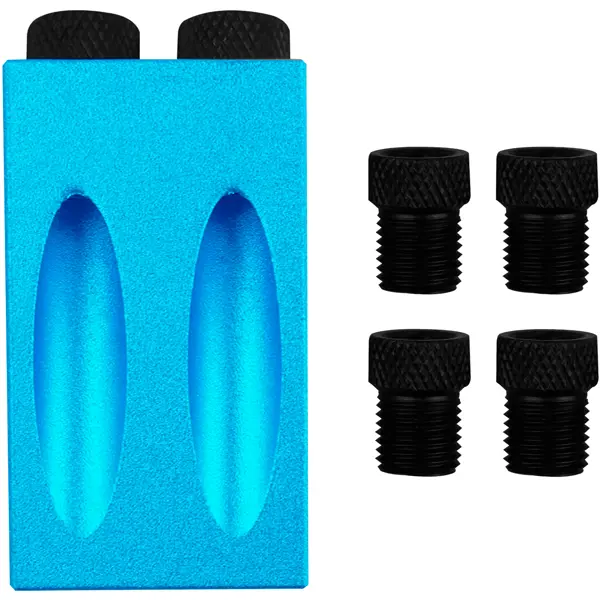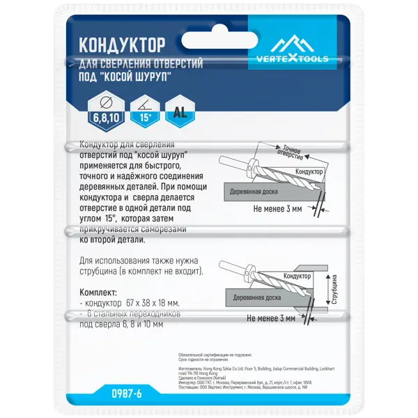 **Шаблон для сверления Vertextools 0987-6** предназначен для обустройства отверстий под «косой шуруп». Используется для быстрого и точного соединения деталей. Сверление происходит под углом 15°. Для проведения работ необходимо применить струбцину (приобретается отдельно). ### Особенности: - позволяет высверливать отверстия под дюбели и шканты; - сфера применения — сборка мебельных, щитовых конструкций; - в комплект входят кондуктор и 6 переходников.