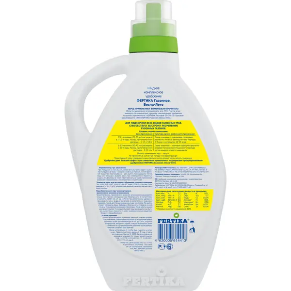 **Удобрение Fertika газонное 1 л** - комплексное минеральное удобрение для подкормки всех видов газонных трав. **Особенности:** - Способствует быстрому укоренению рулонных газонов - Быстрое отрастание после скашивания - Яркость и зелень листвы - Густота травостоя - Микроэлементы в хелатной форме гарантируют максимальную доступность для растений **Нормы и способы внесения:** 1. Травы газонные – некорневая подкормка растений в течение вегетационного периода 2-3 раза с интервалом 10-15 дней 2/3-1 колпачок (25-30 мл) растворить в 1-1,5 л воды. Расход приготовленного раствора – 1-1,5 л/10 м2 2. Травы газонные – корневая подкормка растений в первой половине вегетационного периода после каждого второго скашивания 1-1,5 колпачка (30-45 мл) растворить в 10 л воды. Расход приготовленного раствора – 5-10 л/м2 Полезные советы Не применять в солнечную погоду и во время дождя. Пожелтевший газон предварительно обильно полить водой, затем делать подкормку. Удобрение дает больший эффект п