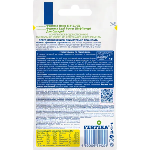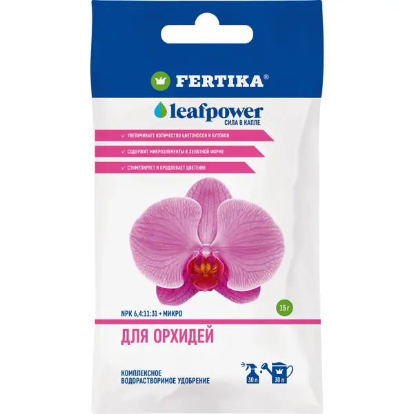 **Удобрение Fertika Leafpower для орхидей 15 г** - полностью водорастворимое комплексное азотно-фосфорно-калийное удобрение, содержащее микроэлементы. Предназначено для подкормки растений различных родов орхидей: фаленопсиса, цимбидиума, ванды, дендробиума, каттлеи и др. **Особенности:** - Способствует длительному и насыщенному цветению - Увеличивает количество цветоносов и бутонов - Микроэлементы в хелатной форме гарантируют максимальную доступность для растений **Нормы и способы внесения*** В период активной вегетации цветка, проводите корневую и некорневую (опрыскивание по листу) подкормки. Корневая подкормка: 1. Фаза активного роста листьев и кончиков корней: 1 грамм удобрения добавить на 2 литра отстоявшейся или кипяченой воды (комнатной температуры или на 2-3 градуса выше), проводить подкормку 1 раз в 7-10 дней. 2. Фаза цветения: В этот период подкормку следует прекратить. 3. После цветения: Подкармливать цветов 1 раз в две недели. 4. Фаза неактивной вегетации: По