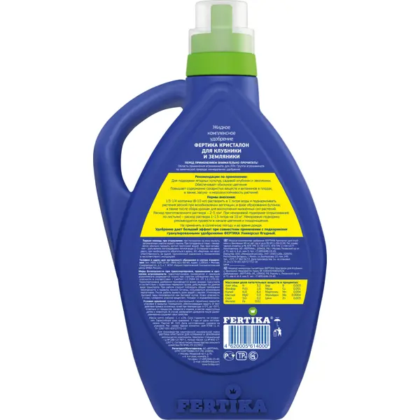 **Удобрение Fertika Кристалон для клубники и земляники 1 л** - профессиональное комплексное минеральное удобрение с микроэлементами. Разработано специально для подкормки плодово-ягодных культур, садовой клубники и земляники. Обеспечивает обильное цветение и плодоношение. Предотвращает магниевый и железный хлороз листьев. Повышает содержание сахаристых веществ и витаминов в плодах, а также засухо- и морозоустойчивость растений **Нормы и способы внесения:** 8-10 мл, развести в 1 литре воды и подкармливать растения весной при возобновлении вегетации, в фазе образования бутонов, а также после сбора урожая для восполнения жизненных сил растений. Расход приготовленного раствора - 2-3 л/м2. Некорневые подкормки ( опрыскивание по листьям, избегать попадание на цветки) - 10 мл, развести в 1 литре воды. Некорневую подкормку рекомендуется провести в начале цветения и плодоношения. Не применять в солнечную погоду и во время дождя. Удобрение дает большой эффект при совместном применен