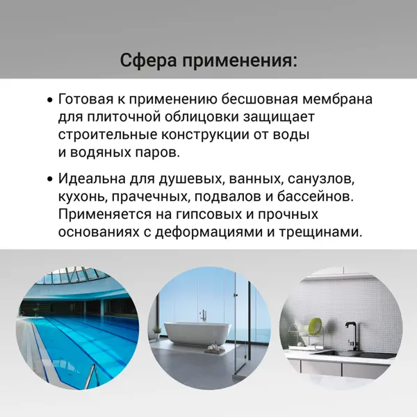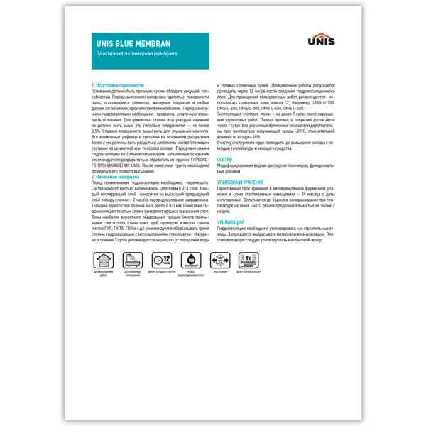 **Гидроизоляция Unis Blue Membran** полностью готова к применению бесшовная мембрана под плиточную облицовку для защиты строительных конструкций от неблагоприятного воздействия воды и водяных паров. Применяется внутри влажных помещений, подвергающихся постоянному воздействию воды: душевые, ванные комнаты, санузлы, кухни, прачечные, подвалы, бассейны, хаммамы. Рекомендуется для гипсовых оснований во влажных зонах, а также для прочных оснований с деформациями, трещинами и швами ### Особенности: - выдерживает давление водяного столба в 60 м высотой; - создает водонепроницаемый слой; - перекрывает трещины глубиной и шириной до 2 мм; - класс водонепроницамости W8; - может наноситься под теплый пол; - обладает высокой адгезией с гладкими и пористыми материалами; - наносится при помощи кисти или шпателя; - рекомендовано для новостроек и частного домостроения; - в пластиковом ведре находится 4 кг состава.