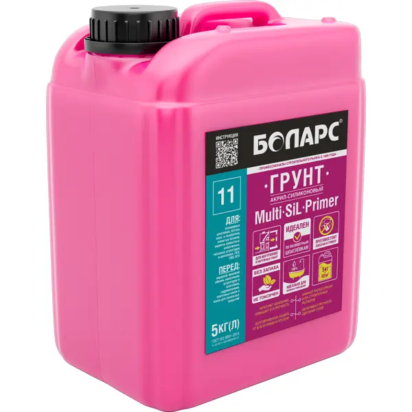 Акрил-силиконовая грунтовка БОЛАРС Multi Sil Primer содержит гидрофобные и фунгицидные добавки. Идеальна для помещений с повышенной влажностью, противостоит плесени и грибку. Укрепляет основание, хорошо блокирует поры даже при нанесении в один слой. Сильно впитывающие основания грунтуются дважды. Грунт снижает впитывающую способность основания, связывает пыль, увеличивает сцепление материалов с основанием. **Применяется перед:** - окраской и оклейкой обоями, - оштукатуриванием и шпатлеванием, - нанесением гидроизоляции, - нанесением плиточных клеев и клеев для напольных покрытий. Грунт имеет молочно-белый цвет, после высыхания становится прозрачным. Нетоксичен, не содержит растворителей, экологически безопасен, почти без запаха. Разрешен для применения в детских и медицинских учреждениях. Используется для внутренних и наружных работ. **Основания** Полимерные шпатлевки; бетон, пено- и газобетон, ячеистые бетоны, газосиликат; кирпич; цементные, известковые и гипсовые ш