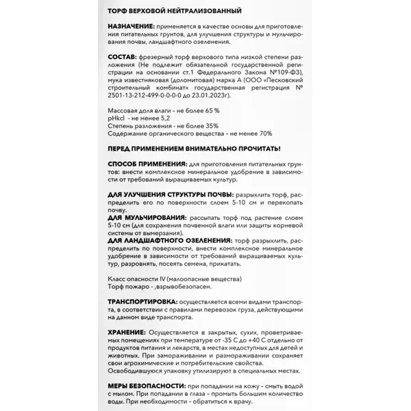 **Торф верховой нейтрализованный** подходит для ландшафтного озеленения. Используется как основа для приготовления грунта. Применяется для улучшения структуры и мульчирования почвы. ### Особенности: - период использования — весна; - уровень pH — не менее 5,2; - объем — 50 л; - массовая доля влаги составляет не более 65%.