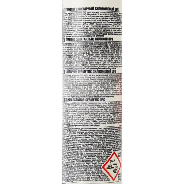 **Герметик силиконовый санитарный Tytan UPG Turbo** предназначен для герметизации и соединения швов, а также для защиты от влажности. Содержит специально подобранный состав средств предотвращающих появление и развитие грибков, плесени, водорослей и т.д. Применяется для герметизации ванн, умывальников, душевых кабин, другого санитарного оборудования и водопроводов, соединения керамических плиток, соединения керамических плиток, мелких ремонтных работ по дому. **Особенности** - отличная стойкость к плесени и грибам - высокая стойкость к УФ-излучению - включает в себя фунгициды, полностью безопасные для пользователя - мгновенная водостойкость после применения в местах с повышенной влажностью - фунгицидные свойства не позволяют силикону изменять его внешний вид и физические свойства на протяжении многих лет - устойчив к высоким температурам - хорошая адгезия к разным основаниям. **Расход:** ориентировочно 11 погонных метров при толщине шва 2мм*2мм. **Подготовка поверхности** Гер
