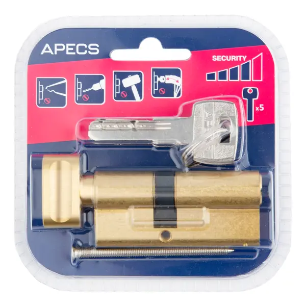 **Цилиндр Apecs Pro** с механизмом «ключ-вертушка» предназначен для входных дверей межкомнатных полотен, требующих запирания с обеих сторон. Устанавливается во врезные замки с отверстием под евроцилиндр. Монтаж не должен проходить с усилием. Бородок в исходном положении выступает за корпус цилиндра. Его вставляют поворотом ключа, после чего приступают к установке. ### Особенности: - основной цвет корпуса — золото; - типоразмер — 40 х 30 мм; - защита от выбивания; - совместимые дверные полотна — деревянные, металлические; - комплектация — перфорированный ключ (5 шт), винт крепления. **БЕРЕЖНО К ЛЮДЯМ, БЕРЕЖНО К ПРИРОДЕ** - Этот товар имеет бесплатную расширенную гарантию от 3 лет. Благодаря увеличенному периоду бесплатного сервисного обслуживания вы продлеваете срок службы товара, экономите на покупке нового в случае поломки и снижаете влияние на окружающую среду.