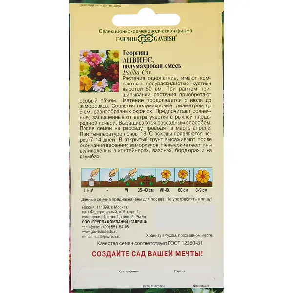 **Семена цветов Гавриш георгина Анвинс смесь окрасок** — однолетнее цветущее растение. Предназначено для украшения приусадебных и дачных участков, территорий парков, многоквартирных домов. Хорошо смотрится на клумбах и в бордюрах, вазонах. На рассаду семена сеют в марте или апреле. Для высадки выбирают период после заморозков. Предпочтение отдают достаточно освещенным участкам, которые защищены от ветра. Грунт должен быть рыхлый, плодородный. ### Особенности: