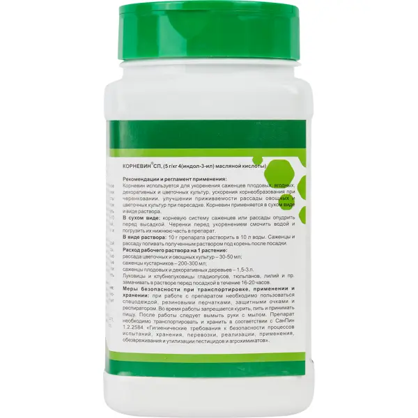 **Стимулятор корнеобразования Корневин** произведен в форме растворимого порошка и расфасован в пластиковые банки по 250 г. Средство используется для обработки семян, луковиц, рассады и корней. Регулирует рост сельхозрастений и стимулирует корнеобразование. Повышает сопротивляемость культур стрессам и агрессивному воздействию окружающей среды, благоприятно отражается на качестве и объемах урожая. При сухом применении препаратом опудривают корневую систему саженцев или рассады перед посадкой. Для приготовления раствора 10 г средства необходимо растворить в 10 л воды, затем полить высаженную культуру под корень. ### Особенности: - легко растворяется в воде; - может применяться как в сухом, так и в растворенном виде; - подходит для обработки плодовых, ягодных, декоративных и цветочных культур; - отличается простотой в использовании; - может применяться как профессиональными садоводами, так и любителями.