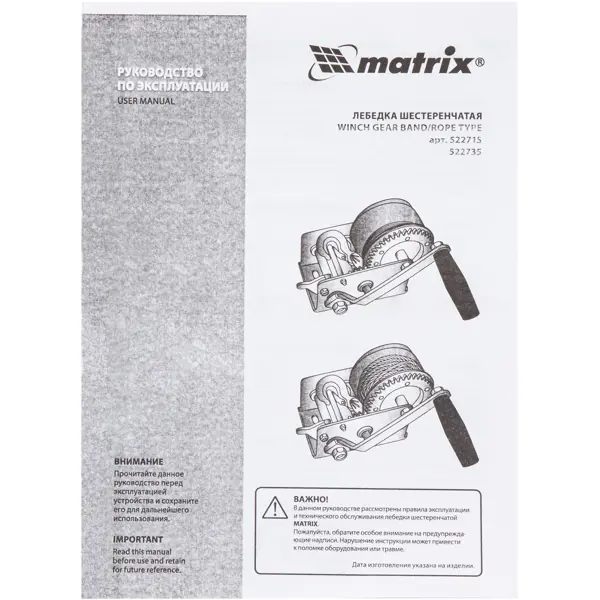 Лебедка шестеренчатая Matrix грузоподъемность до 800 кг