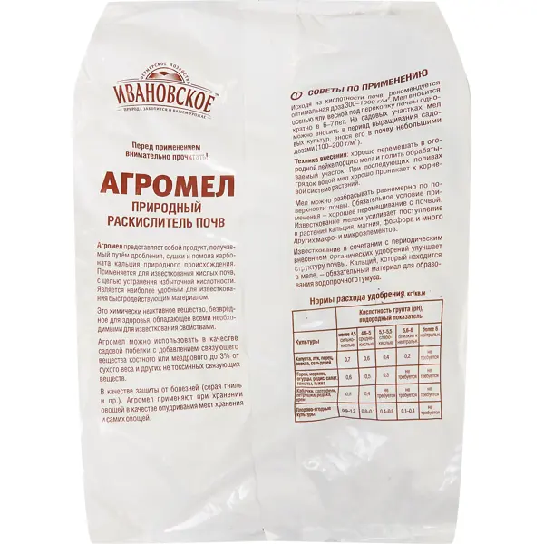 **Удобрение Агромел** — универсальный раскислитель кислых почв. Для защиты от загнивания используется для опудривания корнеплодов. Изготавливается путем дробления, сушки и помола карбоната кальция. Способствует укреплению иммунных и защитных свойств почвы. ### Особенности: - усиливает поступление в растения кальция, магния, фосфора, молибдена, макро- и микроэлементов; - периодическое внесение в почву способствует улучшению ее структуры; - вносится осенью или весной под перекопку почвы; - достаточно 1 внесения в 6-7 лет; - в упаковке находится 1 кг порошкообразного состава.