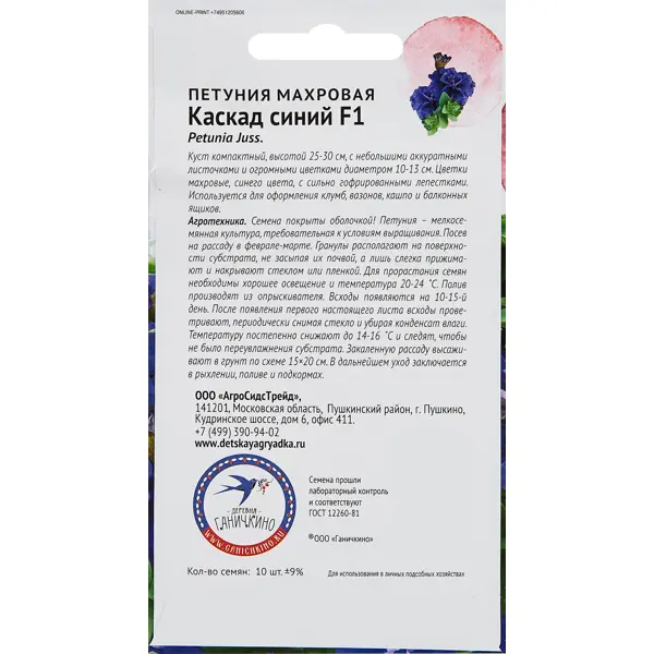 **Семена цветов Семена от Октябрины Ганичкиной петуния махровая Каскад F1** — однолетнее растение. Оно вырастает до 30 см в высоту. Цветы диаметром до 13 см. Окраска — синяя. Может выращиваться в доме в балконном ящике, на клумбе в парке или на дачном участке. При составлении композиций следует размещать петунию на переднем плане, чтобы более высокие растения не загораживали ей свет. ### Особенности: