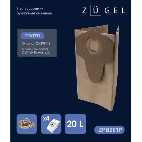 **Мешки бумажные для пылесоса Zugel ZPB201P** предназначены для сбора сухого мусора. Изготовлены из прочного бумажного полотна. Имеют специальный клапан для соединения с системой всасывания пылесоса. **Содержит переработанный материал.** Этот товар изготовлен с применением переработанных материалов. Так мы сокращаем отходы и бережём природные ресурсы. ### Особенности: - емкость мешка — 20 л; - в упаковке идут 4 шт. Подробнее о том, [**как навести порядок на даче весной**](/advice/kraski/kak-navesti-poryadok-na-dache-vesnoy-podborka-sovetov/), читайте в нашей статье.