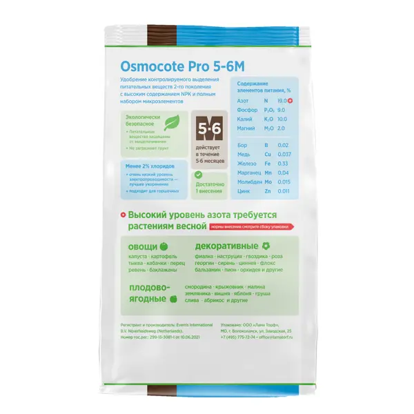 **Универсальное удобрение Osmocote (Осмокот) Pro** пролонгированного действия (5-6 месяцев) предназначено для внесения в грунт весной. Используется для подкормки всех видов растений, которые выращиваются на дачном участке или дома. Растворяется в почве постепенно, что исключает получения корнями ожогов. ### Особенности: - обладает богатым составом — три вида азота, фосфор, калий и микроэлементы; - форма выпуска — мелкие гранулы, заключенные в оболочку из органической смолы; - вес — 1 кг.