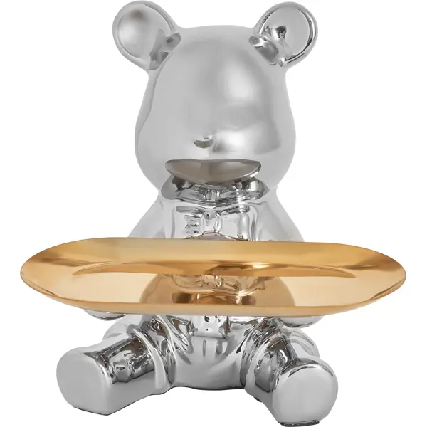 **Подставка Мишка 1** — это декоративный предмет интерьера, который гармонично смотрится на комоде, журнальном или рабочем столе, на полках книжного шкафа или на трюмо. Подставка в виде медведя с подносом размерами 18 х 20 см позволяет хранить различные мелочи на виду: от ключей до конфет. Она выполнена в серебристом цвете, поэтому добавляет элегантность в современные стили интерьера. Гладкие линии и блестящая отделка создают стильный акцент в любом помещении. Статуэтка дополняет классический, индустриальный, скандинавский или шебби-шик интерьера. Она выполнена из прочной керамики с повышенной стойкостью к механическим воздействиям, ультрафиолету, влаге. Материал также проявляет устойчивость к высоким температурам и воздействию большинства химических веществ. Керамика в золотистом исполнении удачно комбинируется с сырыми материалами (металлом и деревом), создает контрасты и добавляет уникальность в пространство. ###Особенности: - хорошо противостоит влаге и загрязнениям; - гладкая по