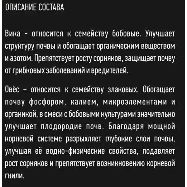 **Смесь сидератов Агросидстрейд Вика-Овес** — средство для восстановления и удобрения почвы. Культуры, содержащиеся в составе, оказывают благоприятное действие на почву: очищают ее от проволочника, защищают от болезней, снижают содержание почвенных патогенов, улучшают структуру грунта. Перед посевом следует тщательно перемешать содержимое. Вес пакета — 1 кг. ### Особенности - период посадки — с марта по сентябрь; - рекомендуемая частота подкормки — 1 раз в месяц; - быстро всходит; - поддерживает существование дождевых червей.