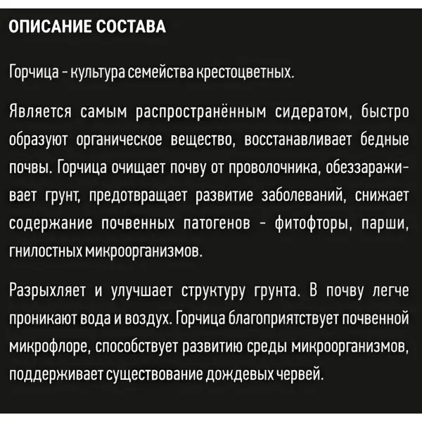 **Сидерат Агросидстрейд Горчица** — средство для восстановления и удобрения почвы. Горчица, содержащаяся в составе, оказывает благоприятное действие на почву: очищает ее от проволочника, защищает от болезней, снижает содержание почвенных патогенов, улучшает структуру грунта. Перед посевом следует тщательно перемешать содержимое. Вес пакета — 1,5 кг. ### Особенности - период посадки — с марта по сентябрь; - рекомендуемая частота подкормки — 1 раз в месяц; - быстро всходит; - поддерживает существование дождевых червей.