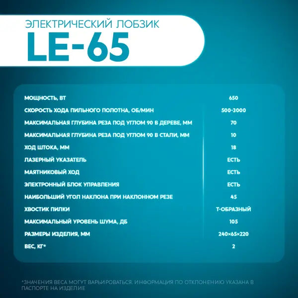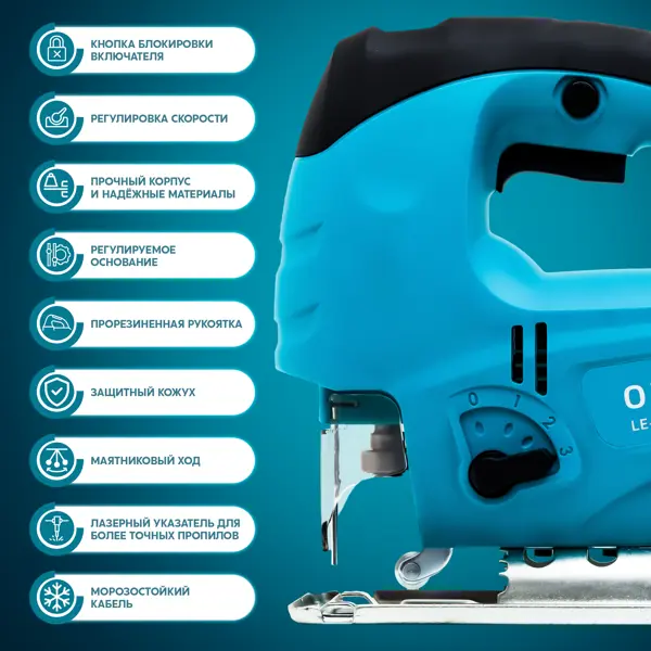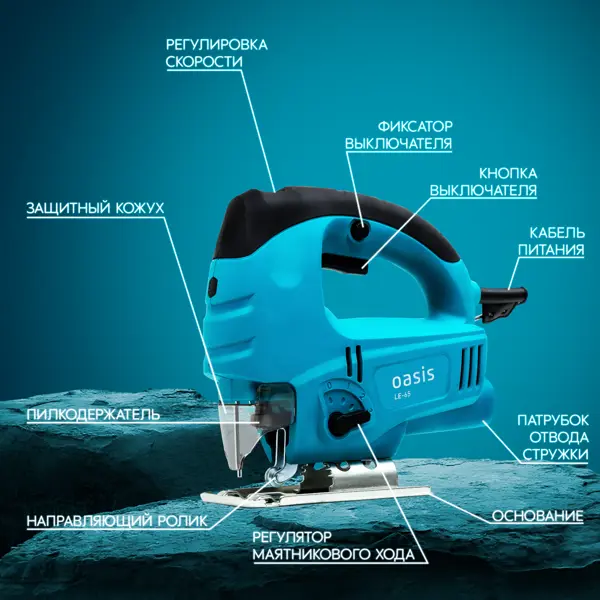**Электрический лобзик Oasis LE-65** – инструмент для быстрого и аккуратного выполнения задач по резке дерева, металла и других материалов. Устройство идеально подходит для домашних мастерских, ремонта мебели или творческих проектов. **Подойдёт для любых задач** Мощность 650 Вт обеспечивает скорость хода пильного полотна до 3000 об/мин. Глубина реза достигает 70 мм в дереве и 10 мм в стали. Угол наклона до 45° позволяет делать фигурные и сложные резы. Маятниковый ход повышает эффективность реза, автоматически регулируя движение полотна для ускорения работы с мягкими материалами, такими как дерево или пластик. Электронный блок управления позволяет регулировать скорость хода пильного полотна. Лазерный указатель значительно повышает точность резов. **Удобство в работе** Компактные габариты позволяют легко маневрировать при работе в труднодоступных зонах. Т-образный хвостовик пилки гарантирует совместимость с большинством стандартных полотен. Фиксатор выключателя позволяет зафиксировать