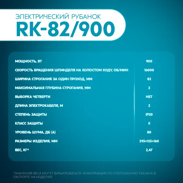 **Электрический рубанок Oasis RK-82/900** идеально подходит для обработки древесины различных пород. Его ключевые особенности включают регулировку глубины строгания и возможность установки бокового ограничителя, что значительно повышает точность работы. **Надежность и гибкость настройки** Износостойкий двигатель мощностью 900 Вт гарантирует высокую производительность и стабильную работу даже при обработке твёрдых пород древесины. Шпиндель вращается со скоростью 16000 об/мин на холостом ходу, что обеспечивает чистую и гладкую поверхность без сколов и заусенцев. Ширина строгания за один проход составляет 82 мм, а максимальная глубина – 2 мм, что позволяет быстро и эффективно снимать значительный слой материала, экономя ваше время. Регулятор глубины резки позволяет выполнять работу точно и аккуратно, от грубой до чистовой обработки. **Комфорт в работе** Алюминиевая подошва гарантирует безупречное скольжение и устойчивость инструмента. Подключение пылесоса или пылесборника минимизирует к