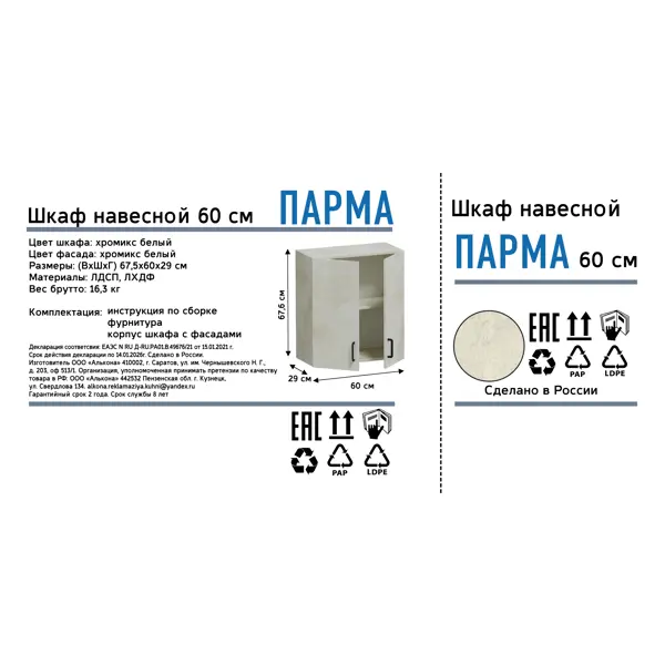 | Состав комплекта | Корпус ЛДСП,задняя стенка ЛХДФ,фасад ЛДСП,фурнитура. |