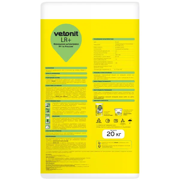 **Полимерная шпаклевка Vetonit LR** наноситься на стены и потолок перед их последующей отделкой; поклейкой обоями, покраской, нанесением декоративной штукатурки. Она позволяет создавать гладкую ровную поверхность белого цвета. Слои сводятся между собой идеально. Шпаклевка расфасована в мешки объемом 20 кг. Смесь разводят водой и размешивают до однородной консистенции дрелью со специальной насадкой, дают настояться в течение 10 минут. ### Плюсы финишной шпаклевки: - длительная жизнеспособность готового раствора - 72 часа; - безопасность для здоровья и природы - шпатлевка Vetonit имеет экологический сертификат, гарантирующий, что в составе смеси нет вредных для окружающей среды и здоровья человека веществ; - универсальность - наносить смесь можно вручную с помощью шпателя или механизированным методом; - сверхпластичность - упрощает нанесение, предотвращает появление трещин после высыхания. Шпаклевание выполняют на очищенные от пыли, обезжиренные стены и потолок. Каждый последующий сло