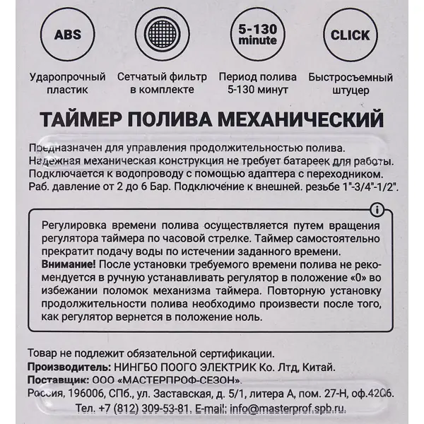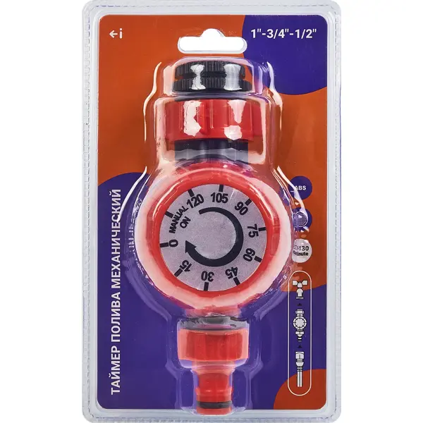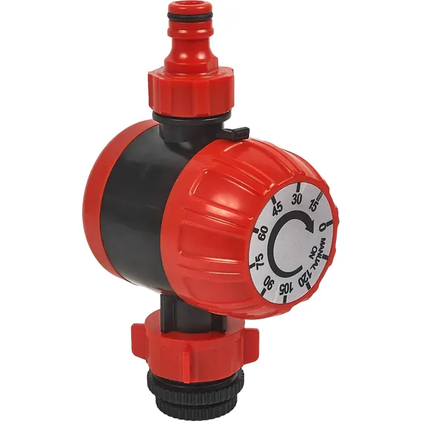 **Таймер механический** рассчитан на один канал поворотный диск, используется для полива — с его помощью регулируют подачу воды при орошении. Диапазон времени работы составляет от 15 до 120 минут. Когда заданные минуты закончатся, таймер сам прекратит работу. Изделие выполнено из ABS-пластика — ударопрочного и легкого материала. Для работы таймера не требуются обычные батарейки, он заряжается от энергии солнца. ### Особенности: - работает на солнечных батарейках; - время полива составляет от 15 до 120 минут; - регулировка времени полива; - цвет — оранжевый; - материал — ABS-пластик.