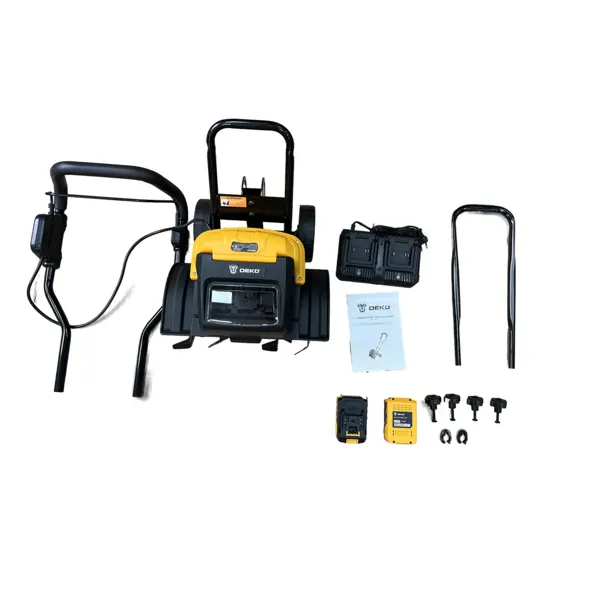 **Культиватор аккумуляторный Deko DKET40** — легкая, маневренная и простая в обслуживании модель для участков площадью до 100 м². Благодаря малому весу (11 кг) этим культиватором удобно работать любому человеку, в том числе женщинам и пожилым людям. Поскольку такой культиватор не выделяет вредных выбросов, его безопасно использовать в парниках и теплицах. Ширина обработки 36 см, что достаточно для маневрирования на узких участках. Вспахивает землю на глубину 18 см. В комплекте зарядное устройство и 2 аккумулятора (4 Ач / 20 В). ### Особенности - Транспортировочные колеса для удобства перемещения. - Индикатор заряда аккумулятора. - Скоба включения с защитой от случайного нажатия. - Высокая мобильность, не зависит от топлива или наличия розеток.